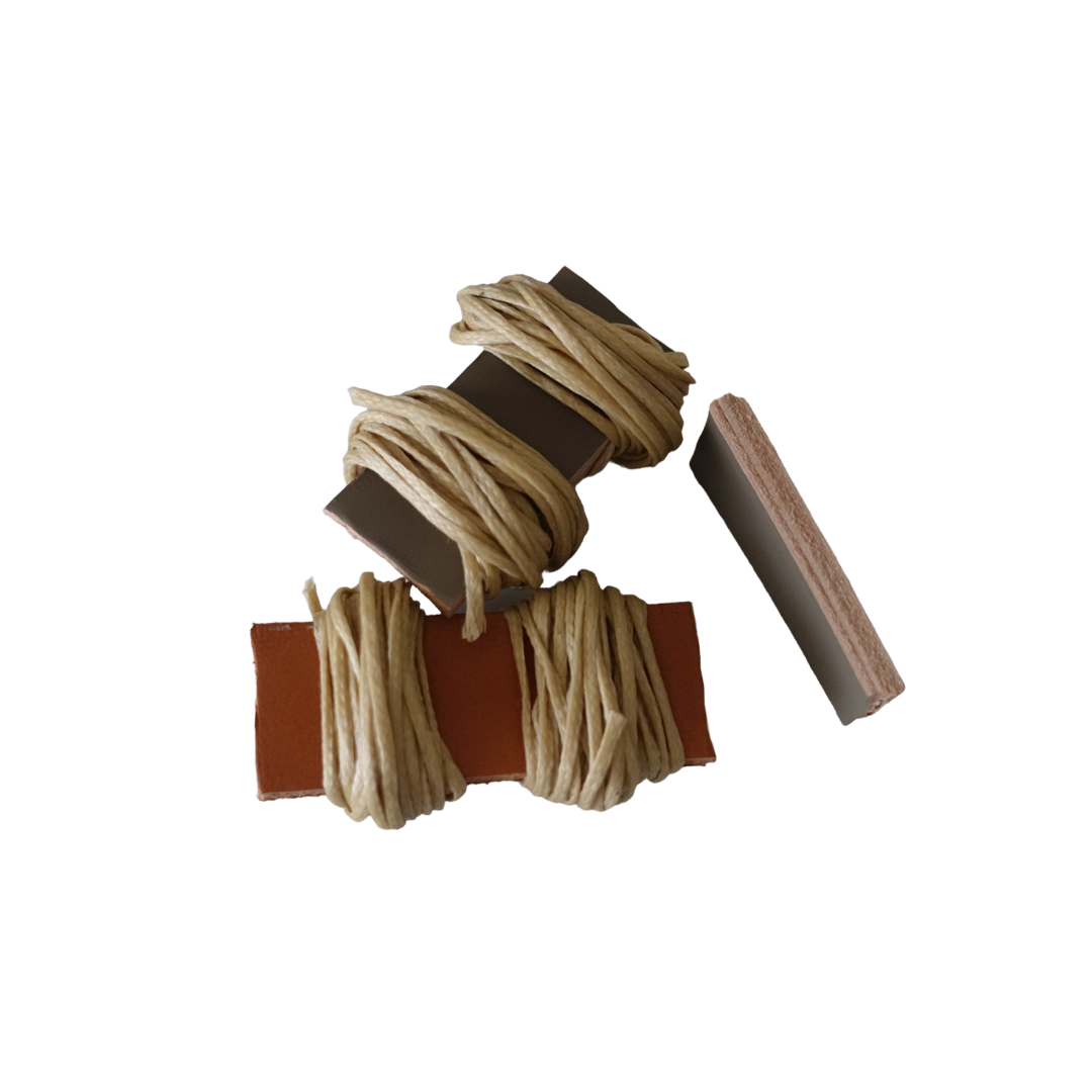 Sono 2 fili da 2,5m ciascuno, avvolti in un pezzo di cuoio recuperato da scarti di Calzaturifici locali.
