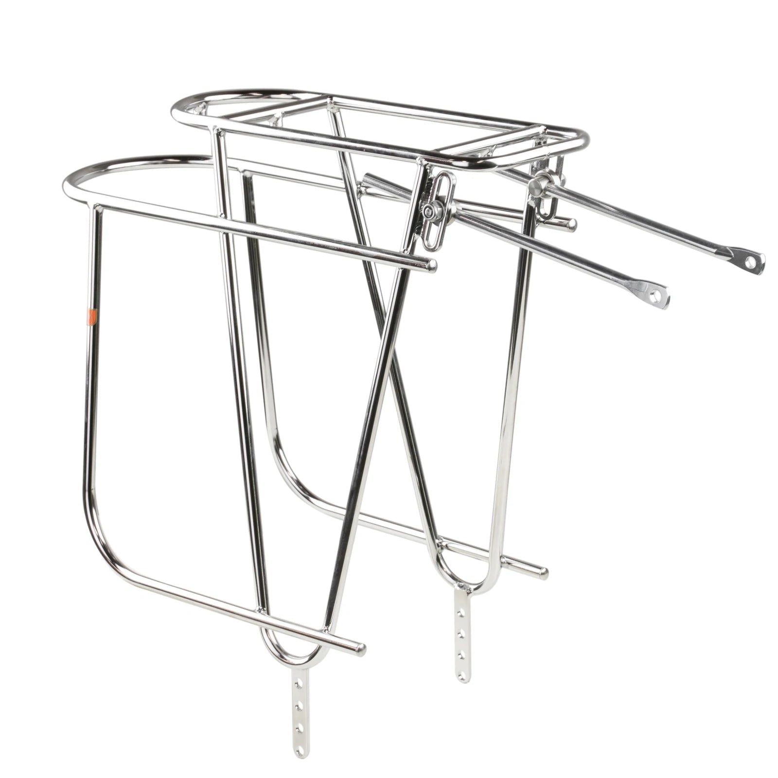 Costruzione in acciaio inossidabile con una bella finitura lucida. Non arrugginisce come le cremagliere in acciaio verniciato o non si affatica e non si rompe come alcune cremagliere in alluminio e verniciate a polvere o verniciate. La guida lunga e inferiore aiuta a portare la borsa più indietro per eliminare il tocco del tallone durante le lunghe pedalate.